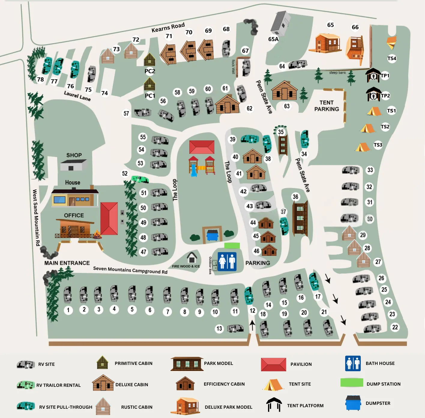 Seven Mountains Campground sits just minutes from some of central PA’s best outdoor spots. Spend the day hiking in Poe Valley State Park, casting a line at Bald Eagle State Park, or strolling through the Arboretum at Penn State. Whether you’re here to cheer on the Nittany Lions or get lost in the woods, there’s plenty to explore.